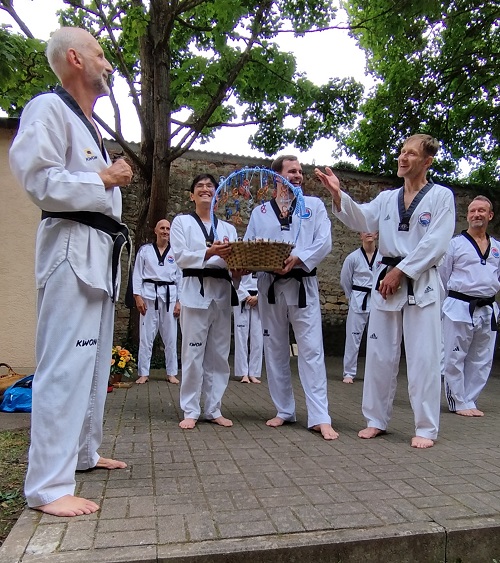Die Fotos zeigen die Langenbacher und Lauinger Taekwondoin zusammen, sowie die Übergabe des Geschenkkorbs von den Langenbachern an Joachim Veh